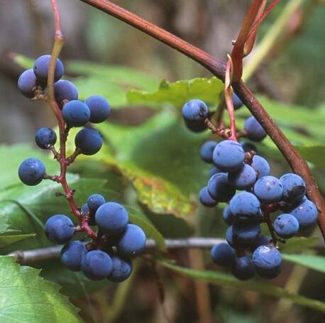 长白山山葡萄又名野葡萄,是葡萄科落叶藤本。藤可长达15米以上,树皮暗褐色或红褐色,藤匍匐或援于其它树木上。卷须顶端与叶对生。单叶互生、深绿色、宽卵形,秋季叶常变红。圆锥花序与对生,花小而多、黄绿色,雌雄异株。果为圆球形浆果,黑紫色带兰白色果霜。花期5-6月,果期8-9月。主产于辽源市长白山余脉和长白山区向松嫩平原过渡地带。